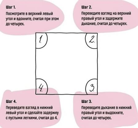 Дыхание по квадрату. Представьте коробку или квадрат с равными сторонами. Каждая сторона вашего квадрата- один такт дыхания: вдох, задержка дыхания. Как и стороны квадрата, такты равны: каждый длится по 4 счета или секунды.